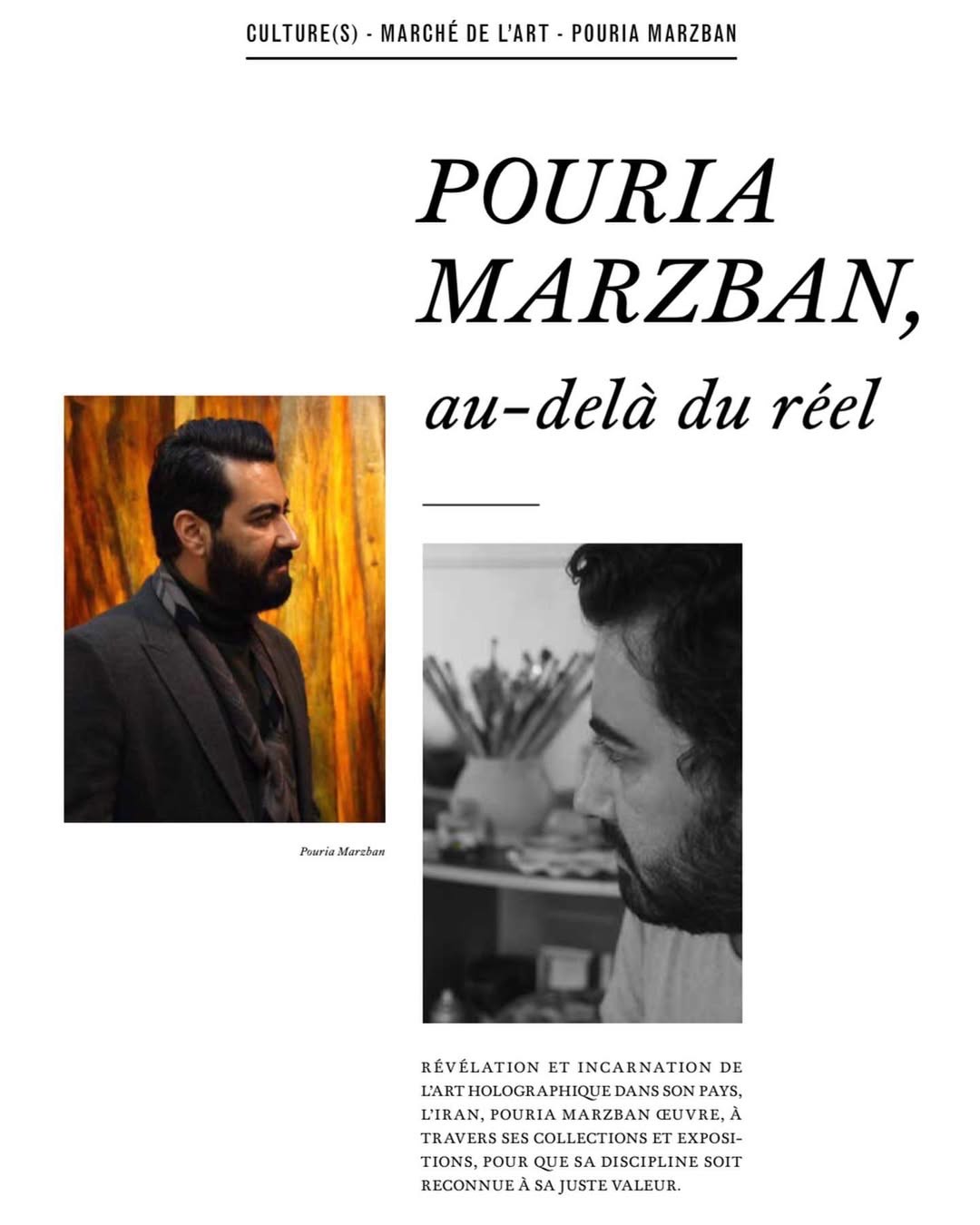 A few months ago, with pride and wonder, I came across a multi-page article in a prestigious French magazine whose title captivated me: «POURIA MARZBAN, au-delà du réel» – Pouriya Marzban, Beyond Reality. With a precise and profound pen, the author spoke of the world of my studio in Tehran—a world where luminous forms float in the void, colors shift with the movement of the viewer’s head, and time loses its meaning. Reading these words was a moment of deep reflection—a confirmation that my “Holographic World” series has begun to attract meaningful attention.